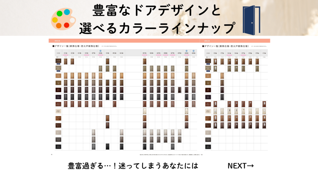ドアをお選びの際は「ファミロック」「断熱仕様ドア」「通風機能付きドア」「採光機能付きドア」もぜひ選択肢に。