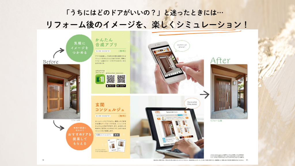 ドアのデザインや色選びは、オンラインカタログやシミュレーションサイトもございますので、スマホアプリからお好きな時間や場所で、より具体的にご検討いただけます。