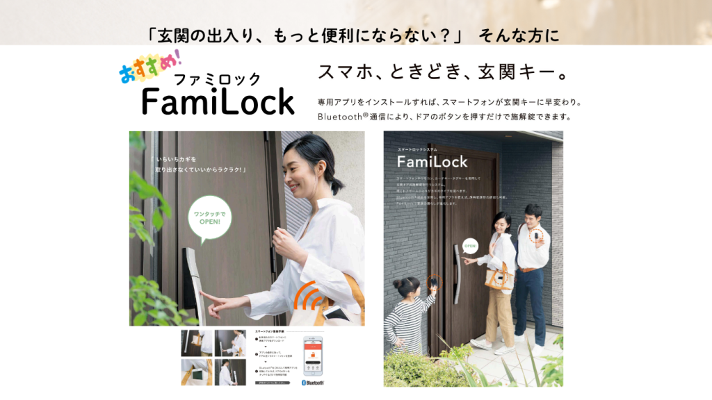 ・ファミロック機能=自動車のスマートキーのように、カバンからキーを取り出さなくてもボタンで開閉できます。スマホを登録しても同様に使えます。タグやカードを家族分追加もOK。